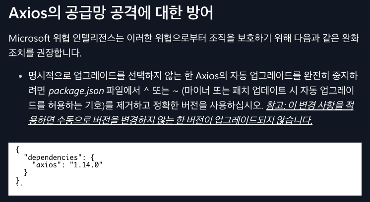 최근에 axios 공격이 큰 화재가 되고 있다. 특정 버전의 axios에 악성 코드가 삽입되어 3월 30일부터 31일 사이에 해당 패키지를 install한 경우 서버의 중요한 키나 파일들에 탈취 위험이 생겼다.